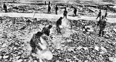 In che cosa furono occupati i nostri ragazzi? Vien da pensare (e lo avevamo immaginato noi stessi) che, data la vastità dell'organizzazione di soccorso e di recupero ad essi fossero riservati lavori marginali, servizi secondari, imprese di completamento negli angolini dimenticati: servizi questi non meno degni per la nostra concezione scout. Ma la realtà fu ben diversa. L'organizzazione era vasta, ma per la sua stessa vastità, impacciata: le cose presero a filar bene solo dopo cinque o sei giorni: ma era nei primi giorni che l'urgenza si faceva sentire. Soldati e vigili dei fuoco erano concentrati a Longarone, entro la zona proibita del disastro, ma la metà delle vittime era stata trasportata dal Piave a 10-12-15 km. di distanza e giaceva sotto enormi ammassi di legname nelle anse e nelle secche dei fiume. A Cadola; a Fortogna, a Ponte nelle Alpi e più giù a Belluno e a Mel, i soccorritori erano pochi e non ben distribuiti, i volontari pochissimi, stuolo immenso i curiosi.
