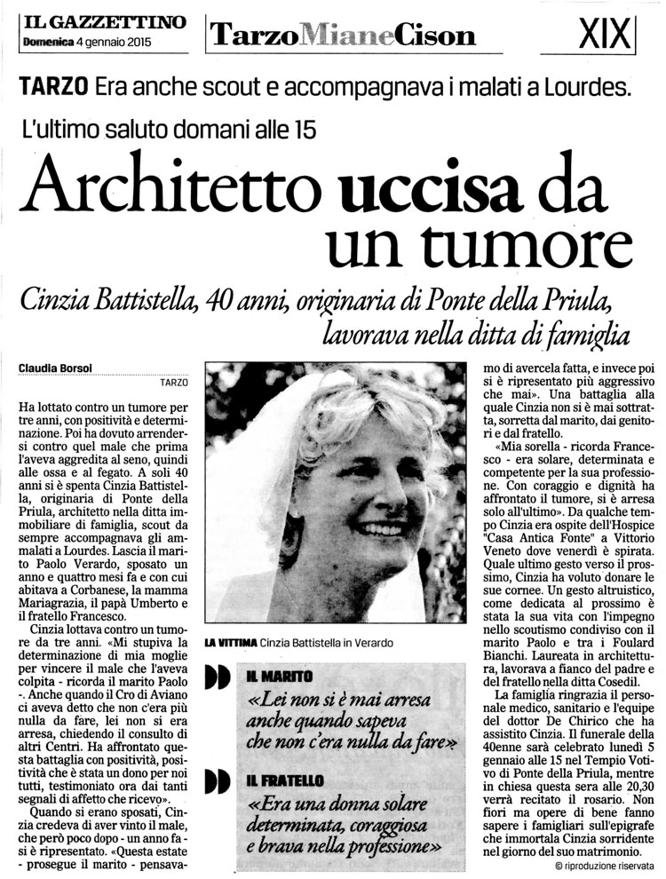 tornata a casa», ha scritto Cinzia Battistella, stroncata da un tumore a 40