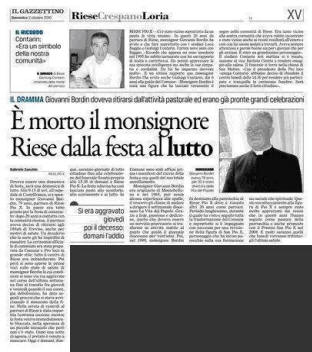 Domenica 3 Ottobre 2010, Gabriele Zanchin IL DRAMMA Giovanni Bordin doveva ritirarsi dall'attività pastorale ed erano già pronte grandi celebrazioni E' morto il monsignore. Riese dalla festa al lutto