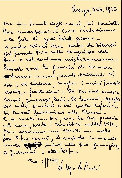 stralcio della sua lettera datata "Asiago, 3 settembre 1952", dalla quale traspare la sofferenza