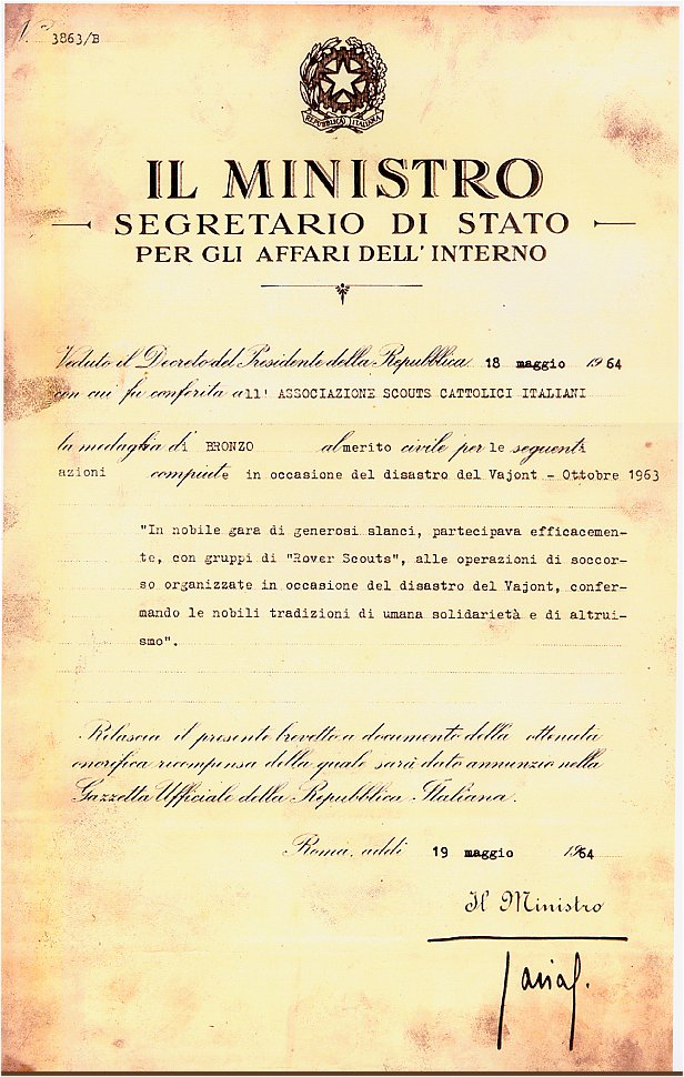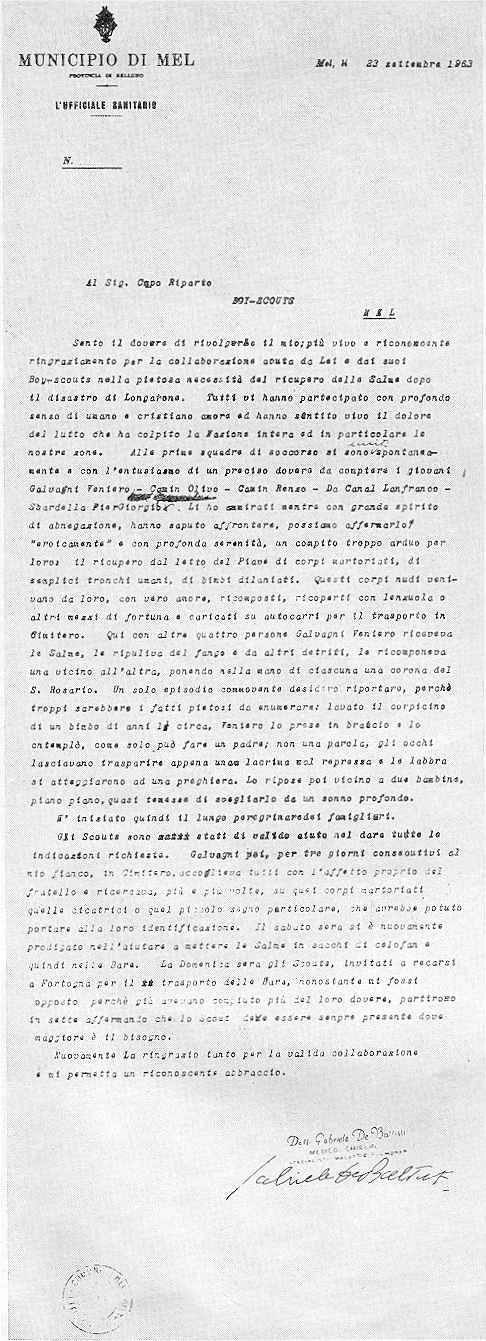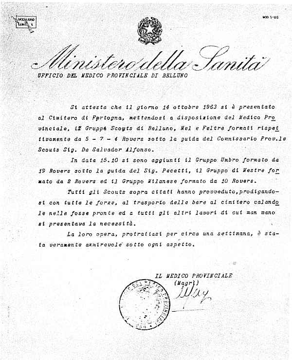 L'attestato dell'Ufficio Medico Provinciale di Belluno sull'opera svolta con spirito cristiano dagli Scaut in occasione delle tristi giornate di Longarone.