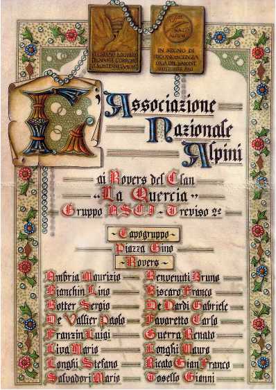 L'attestato di riconoscenza dell'Associazione Nazionale Alpini ai Rovers del Clan la Quercia del Gruppo TV2° per l'opera svolta