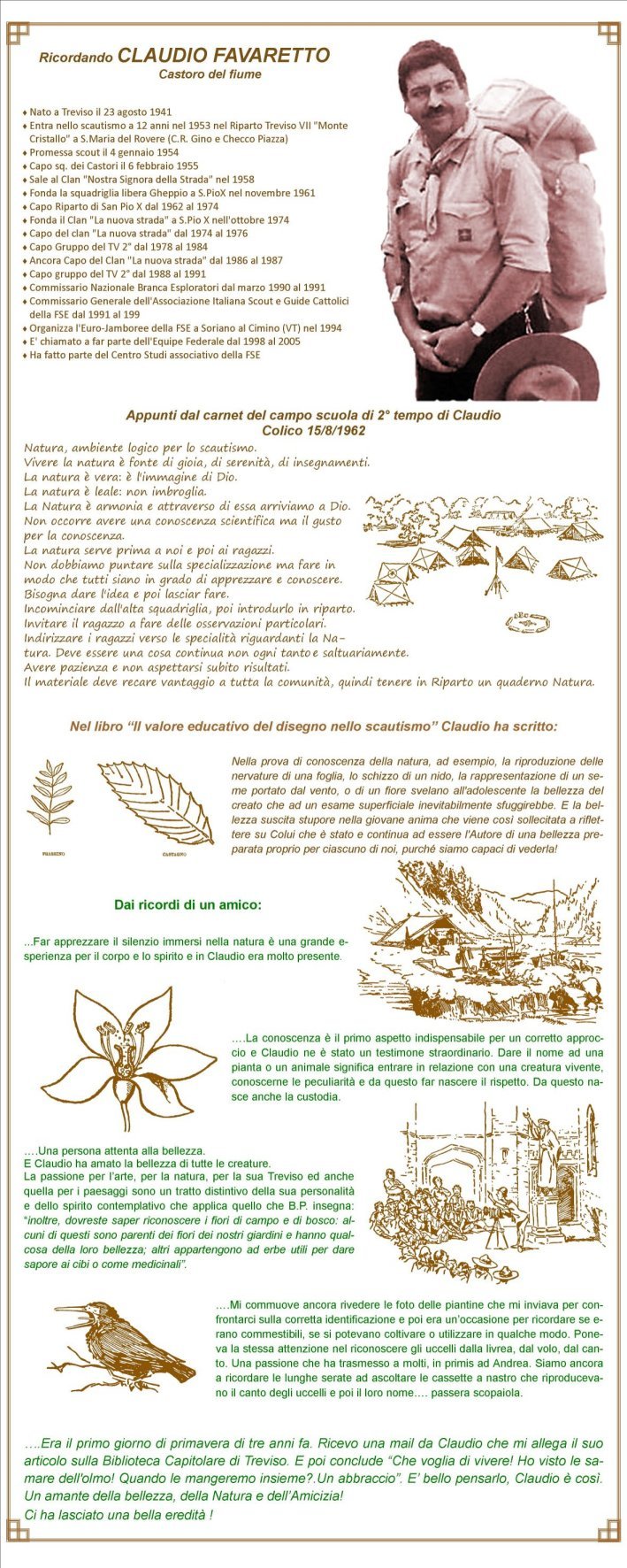 Nella ricorrenza del primo anniversario della improvvisa scomparsa di Claudio Favaretto, un nutrito gruppo di amici e Capi scout si sono proposti di ricordare la sua figura di educatore sia nel movimento scout che nella scuola, facendosi promotori di una giornata all’anno dedicata a uno degli aspetti dell’azione educativa in cui Claudio ha lasciato una traccia indelebile della sua passione per la conoscenza della natura, della storia di Treviso, della storia dell’arte, della musica, dello studio delle tradizioni, dei canti popolari, ecc.