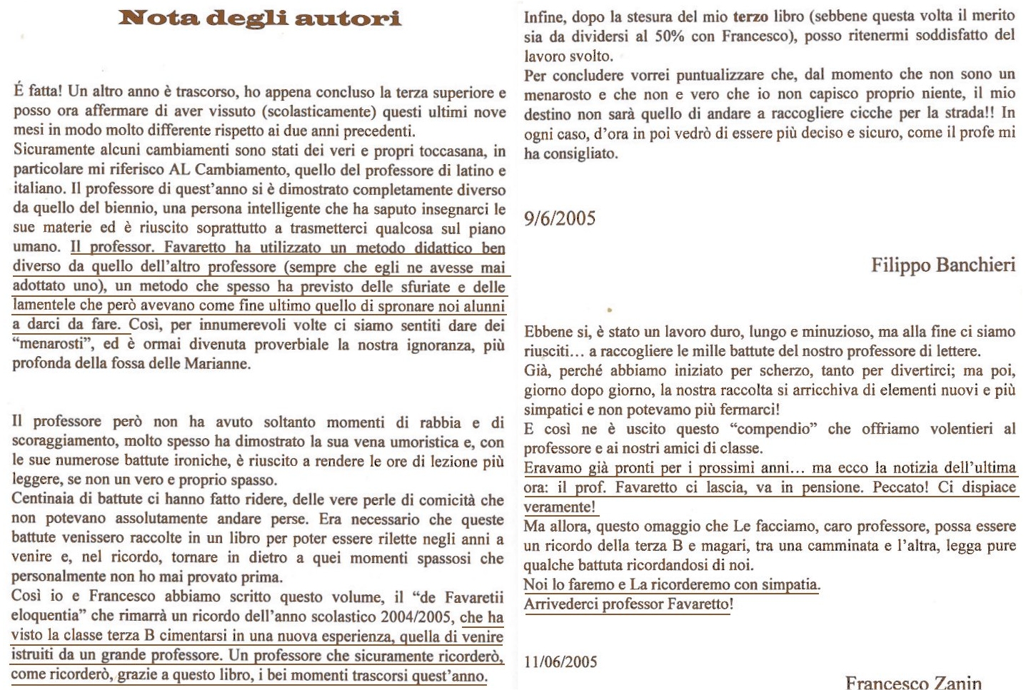 - Nella nostra ultima ora di lezione per congedarsi ci annuncia il suo pensionamento esprimendo rammarico per doverci lasciare: "mi dispiace..., anche se mi avete fatto soffrire come un cavallo, di lasciarvi in mezzo al guado.." |